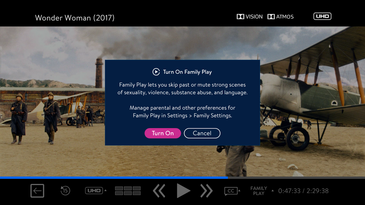 Family Play lets you skip past or mute intense scenes of sexuality, violence, substance abuse, and language. Customize categories based on your preferences and turn them on or off anytime.